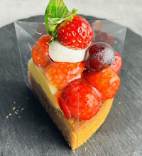 濃厚なチーズタルトに自家製苺のコンフィチュール、フレッシュの苺から作った苺のババロアを組み合わせ、苺の生クリームで仕上げました